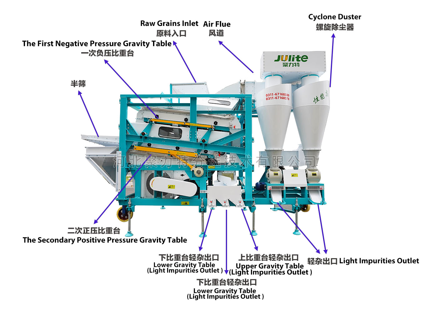 物料通過輸送設(shè)備經(jīng)喂入斗進(jìn)入第一道負(fù)壓比重臺,通過風(fēng)選去除物料中的粉塵、糠殼等輕雜質(zhì),輕雜經(jīng)風(fēng)道、螺旋除塵器,由閉風(fēng)器排出收集;通過比重選有效去除物料中的秸稈、軸塊等比重較輕的雜質(zhì)。后物料通過導(dǎo)糧機(jī)構(gòu)進(jìn)入第二道正壓比重臺,通過調(diào)整風(fēng)量、擋板位置等進(jìn)行比重加工,有效去除物料中的碎粒、秕籽、芽粒、蟲蛀粒、霉變粒等雜質(zhì)。最終成品從比重臺高處排出。