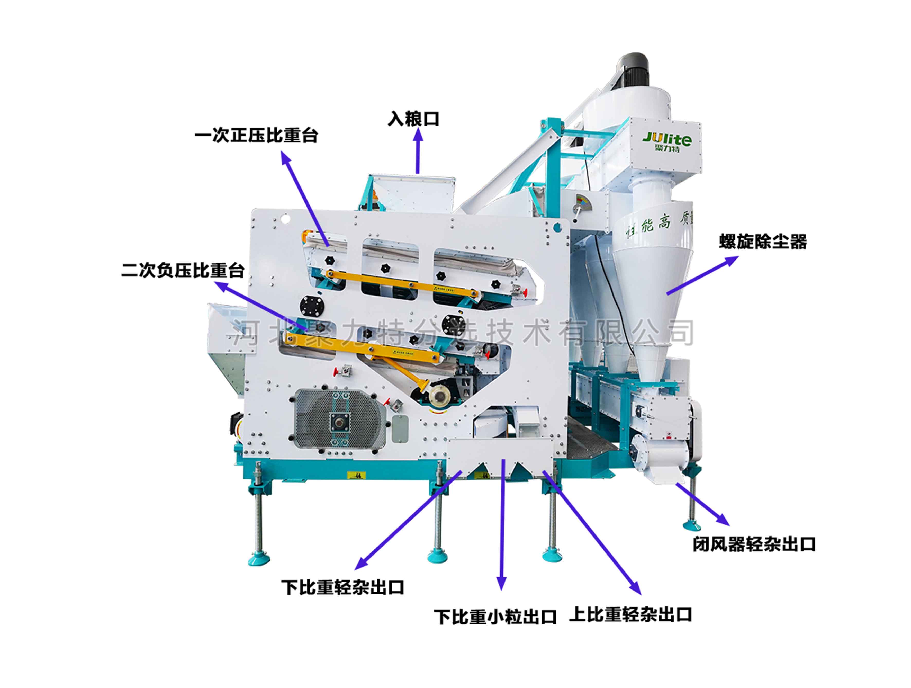 物料通過輸送設備經(jīng)喂入斗進入第一道負壓比重臺,通過風選去除物料中的粉塵、糠殼等輕雜質,輕雜經(jīng)風道、螺旋除塵器,由閉風器排出收集;通過比重選有效去除物料中的秸稈、軸塊等比重較輕的雜質。后物料通過導糧機構進入第二道正壓比重臺,通過調整風量、擋板位置等進行比重加工,有效去除物料中的碎粒、秕籽、芽粒、蟲蛀粒、霉變粒等雜質。最終成品從比重臺高處排出。
