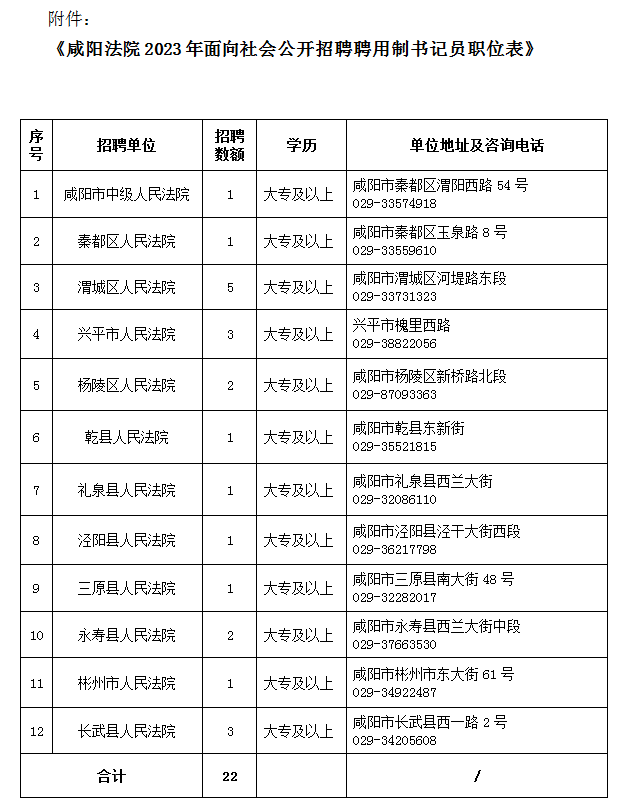 全市法院共招聘聘用制書(shū)記員22名,各法院招聘職位、地址及政策咨詢(xún)電話詳見(jiàn)《咸陽(yáng)法院2023年面向社會(huì)公開(kāi)招聘聘用制書(shū)記員職位表》(附件)。